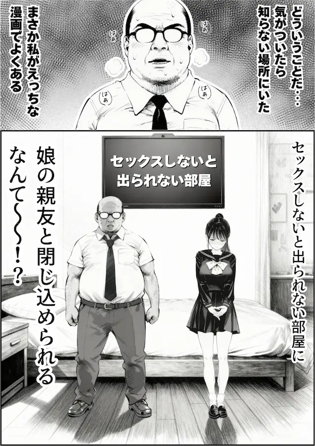 知らない部屋で目を覚ました冴えない中年男性が、娘の親友である純情系の女子と一緒に「セックスしないと出られない」という理不尽なシチュエーションに放り込まれる、王道の監禁エロ設定がベースになっています。
