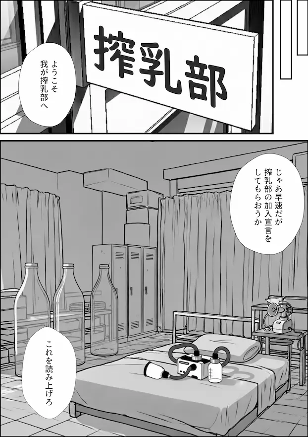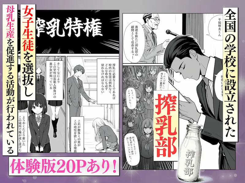 舞台は牛が絶滅してしまい、若い女の子の母乳が国家資源レベルで重宝される20XX年。全国の学校に「搾乳部」が設立され、その中でも母乳生産量日本一の変態名門校「搾乳女学園」に、主人公の教師が顧問として赴任してきます。