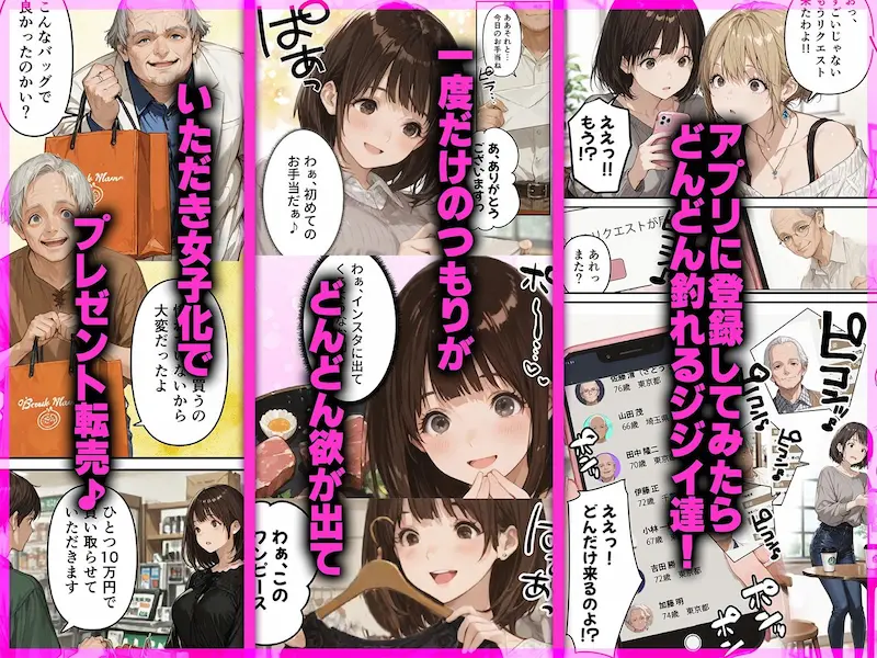 超人見知りで恋愛経験ゼロの地味女子・美弥が、「性欲も枯れたおじいちゃんなら安心」とジジ活に手を出した結果、調子に乗った搾取行為がバレて地下個室に監禁され、口・膣・アナルをジジイたちに代わる代わる犯されて快楽堕ちしていくお仕置き系エロ同人です。